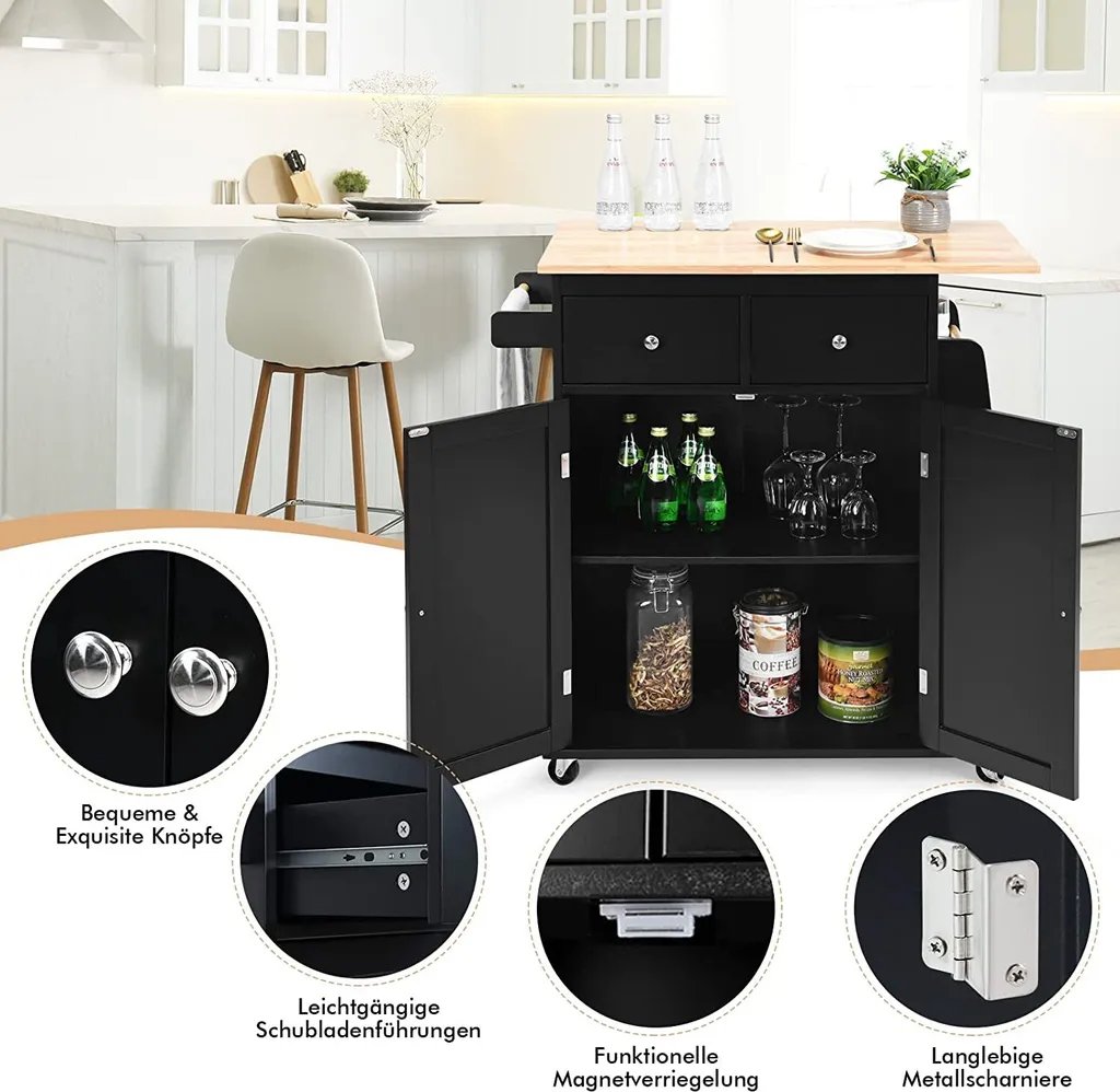 Dieser Rollwagen verfügt über ein modernes, schlichtes Design und eine Tischplatte mit natürlicher Holzmaserung, die perfekt zu jedem Einrichtungsstil passt. Inzwischen kann diese praktische Kücheninsel mit Stauraum auch als Kaffeebar, Konsolentisch oder Serviertisch im Wohnzimmer, Esszimmer, Restaurant usw. verwendet werden.