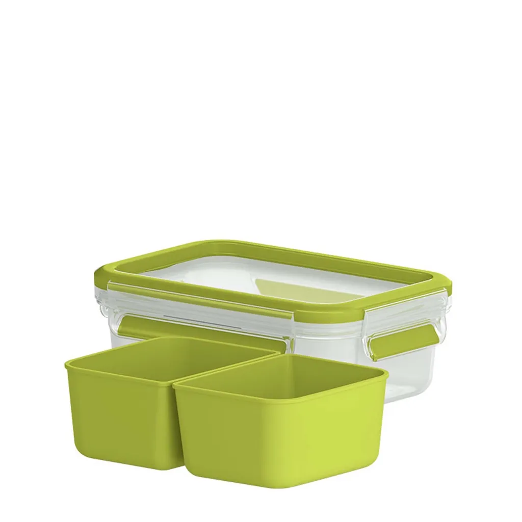 Mit transportsicherem Clipverschluss und 2 praktischen Einsätzen. Selbst flüssige Lebensmittel lassen sich sicher transportieren. Mikrowellen- und gefriergeeignet. Spülmaschinenfest.