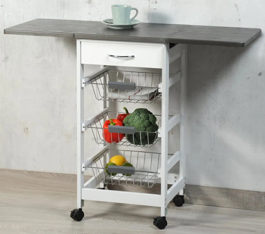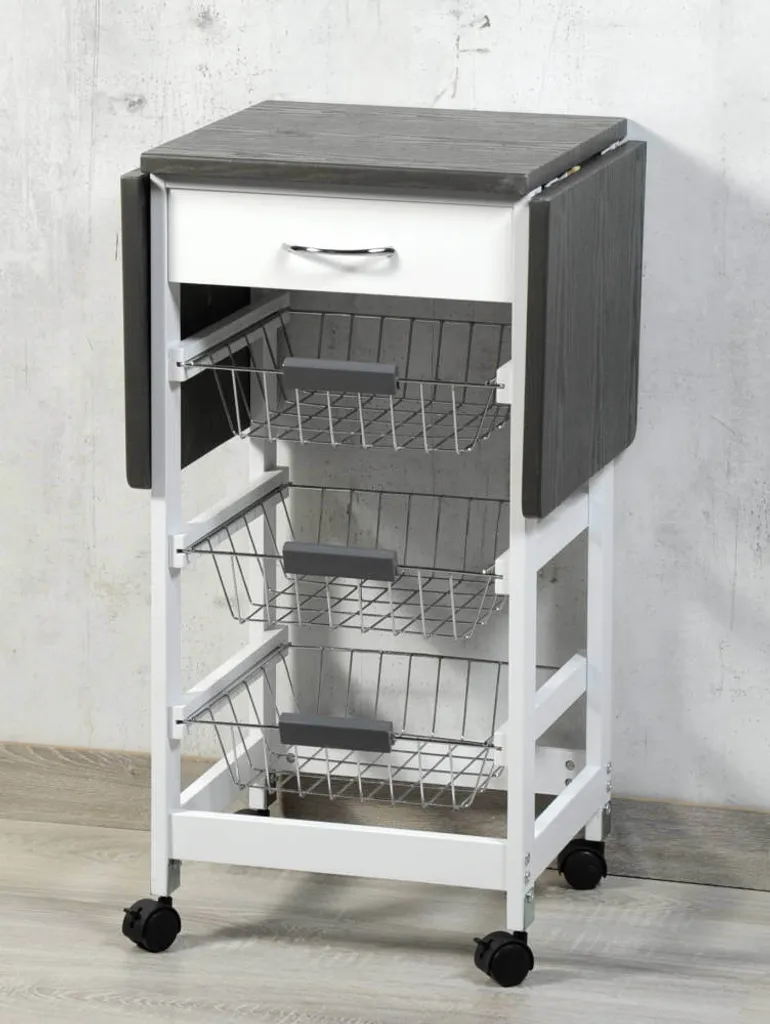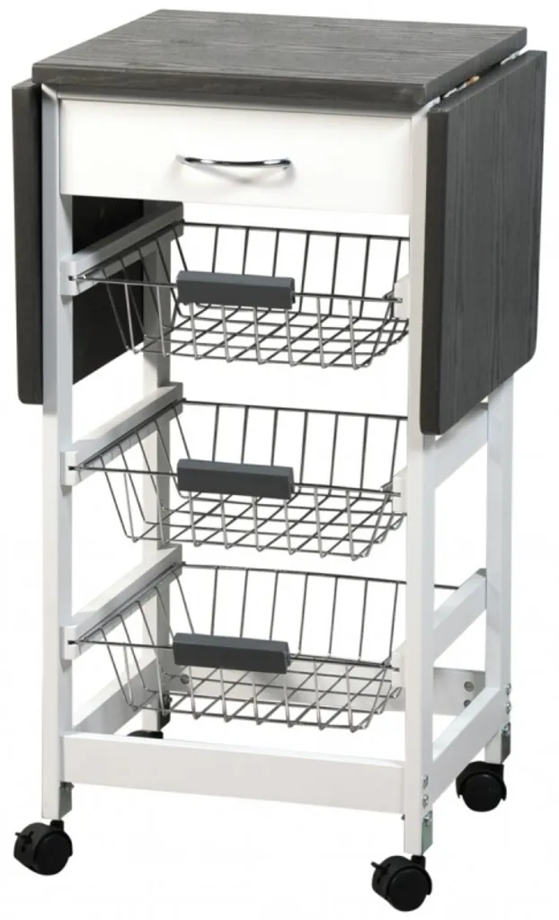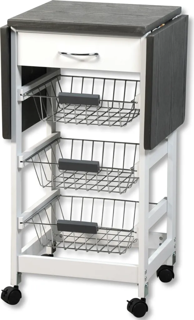 Dieser Küchenwagen dient optimal zur Aufbewahrung von Obst und Gemüse oder auch kleineren Utensielien. Praktisch sind nicht nur die 3 ausziehbaren Metallkörbe, sondern auch die an beiden Seiten ausklappbaren Arbeitsplatten und seine Schublade.