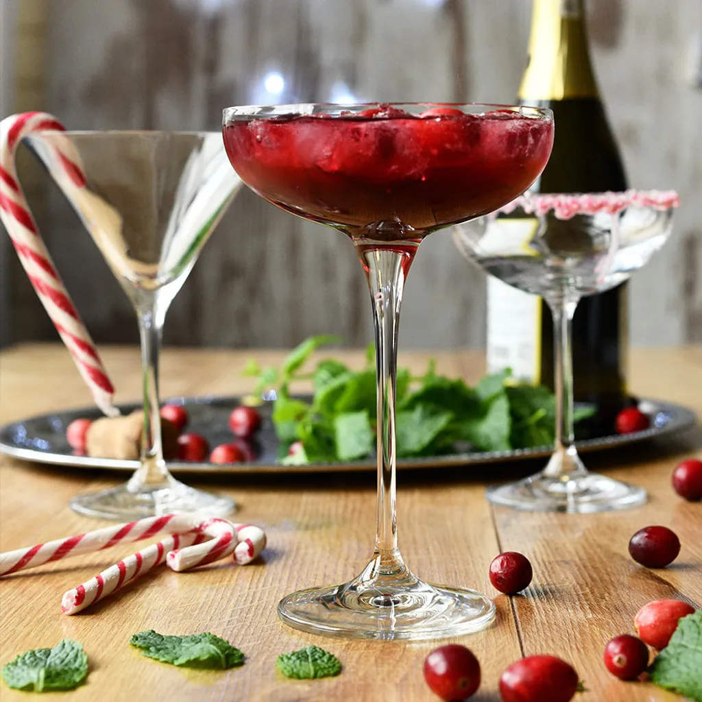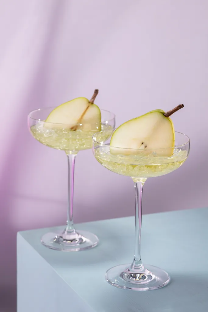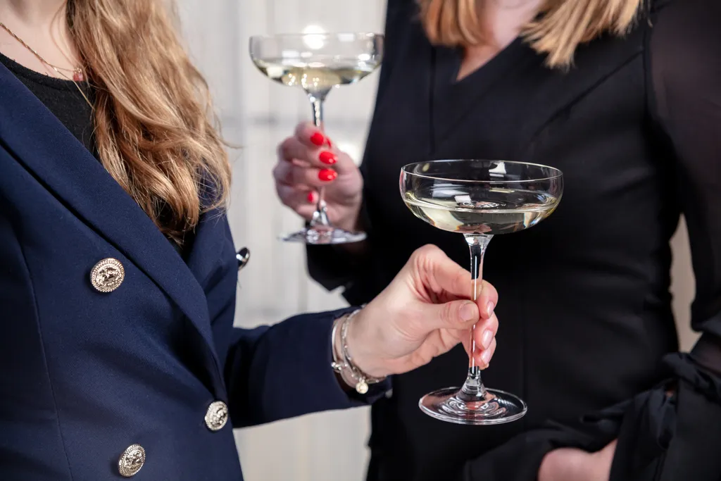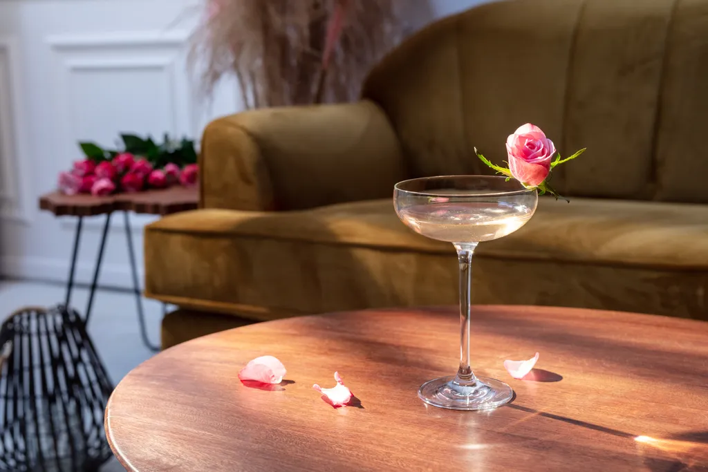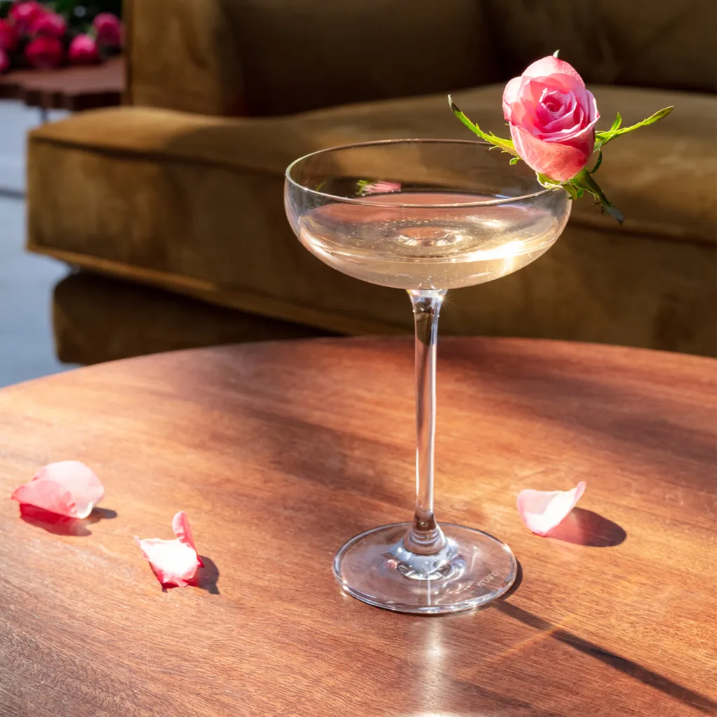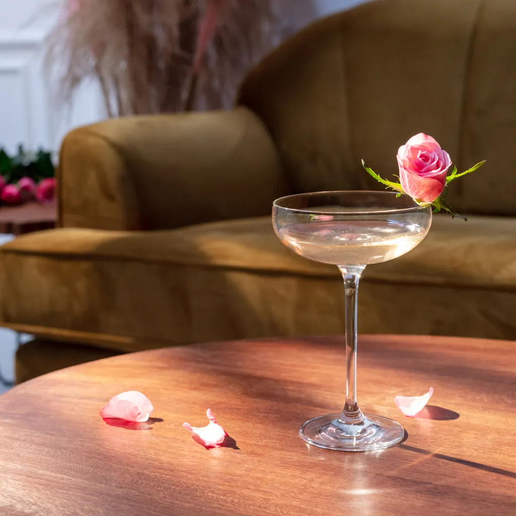 INTERESSANTES DESIGN – Ein flacher, breiter Glaskelch wird nicht nur im klassischen Interieur gut aussehen. Der hohe Stiel auf einem stabilen Boden verhindert das Erhitzen des Getränks.