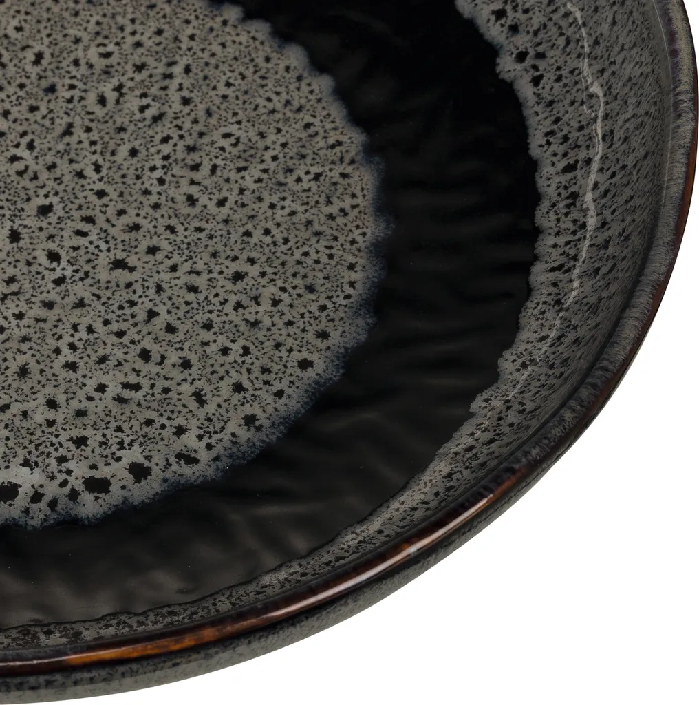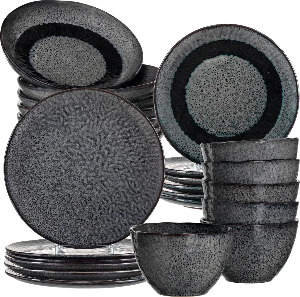 Die handaufgetragene Effekt-Glasur ist widerstandsfähig, langlebig und zaubert Extravaganz auf den Tisch. Dank einfacher Reinigung in der Spülmaschine erweist sich das Geschirrset als besonders robust und alltagstauglich. Auf den Tellern und in den Schalen können Speisen schnell in der Mikrowelle erhitzt werden. In kleineren Schränken findet das Geschirrset gestapelt sehr gut Platz.